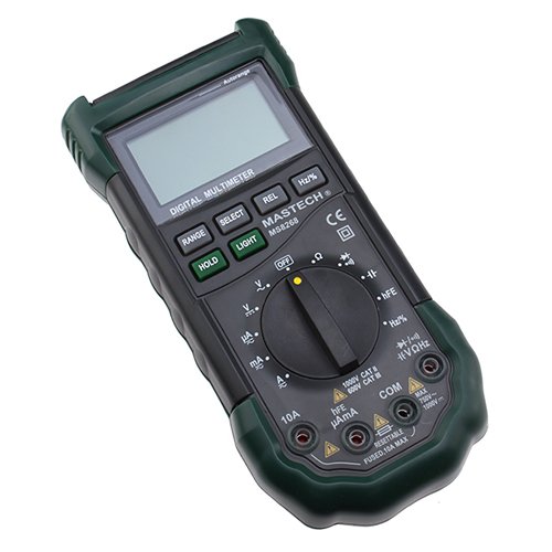 The newly released Mastech MS8268 is an auto/manual ranging digital multimeter. It is packed with many nice features such as sound and light warning for the jacks and back-lit LCD Screen. This meter powers on three AAA batteries. Accessories include test leads & user Manual.Conform to the IEC1010-1 standard CAT III 600V and CAT II 1000V